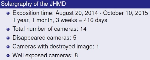 V roce 2014, se svolením ředitelství (Boris Agostini, Petr Matlas) jsem mohl nainstalovat kamery ve vlacích a na železničních stanicích Jindřichohradeckých místních drah (JHMD). V srpnu 2014 se podařilo udělat pár dvoutýdenních testovacích záběrů, a pak více něž tucet kamer, které byly exponované po dobu více než jeden rok (srpen 2014 - říjen 2015).
